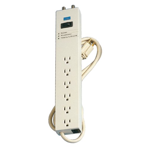 120 Volt 15 Amp Surge Protected, 6-Outlet Strip w/Switch & CATV, Data Sensitive, 1620 Joules, 330V Impulse Clamping, 6 Feet 14-3 SJT Cord Length, Plastic Housing - Beige , UPC: 07847783039
