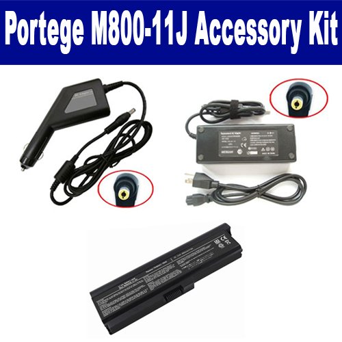 Toshiba Portege M800-11J Laptop Accessory Kit includes the following items: 1) SDB-3354 Laptop Battery - Lithium-Ion - Ultra High Capacity Rechargeable (6 Cell - 4400 mAh - 49wh - 11.1 Volt) Replacement for Toshiba PA3818U Laptop Battery 2) SDA-3507 Laptop Adapter (19 Volt, 3.95 Amp, 75 Watt) 3) SDA-3557 Laptop DC Adapter / Car Charger (19 Volt, 3.95 Amp, 75 Watt)