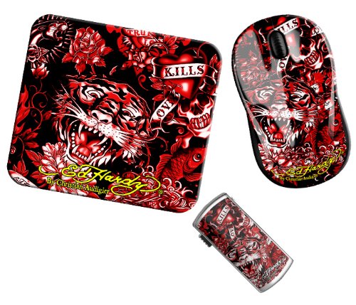 Red Ed Hardy limited edition Tattoo Combo Pack with a Mouse Pad, USB drive and Optical Mouse. The mouse pad is 7.5-Inch X 6.7-Inch X .01-Inch. The USB is 2 GB and 2-Inch long. The Optical Mouse is 4.5-Inch X 2.25-Inch X 1