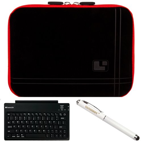 Keep your device protected at all time with this Stylish SumacLife Sleeve Cover. The SumacLife Sleeve features a fitted design for a snug, secure fit and soft, cushioned interior. The soft neoprene bubble padded interior cushions protects your device from bumps, dents, and scratches. The 4 way elastic corner restraint straps allow you to keep you device safely inside the sleeve and prevent it from falling out when of the case when opened. The dual zipper opening allows you quick and easy access to your device. It also keeps the cover firmly closed for maximum screen protection. The rear exterior pocket slot allows you to carry chargers, data cables, and memory cards along-side your device for convenience on the go. Exterior Dimensions 9.0 x 6 1/4 x 0.3 inches.Includes White - Executive VanGoddy Stylus Pen with Laser Pointer and LED Light. 3 in 1: Stylus Point to navigate on Resistive Screens, White LED light and Red Laser Pointer (Batteries INLCUDED. Remove Papper Cover from the battery in order to use the LASER). The Soft-Touch Stylus for Finger-Touch Screens lets you type, tap and scroll effortlessly on a finger-touch screen. We all know typing on a touch-screen can be frustrating at times and almost impossible if you're wearing gloves. The Soft-Touch Stylus is the perfect solution as it lets you type with precision and tap or scroll with ease. Soft-touch tip won't scratch your screen. Includes A completely cable-free Wireless Keyboard that uses Bluetooth technology to connect with your device. So you're free to move the keyboard just about anywhere within range and wirelessly type away. And its slim, compact design takes up much less space on your desk.
