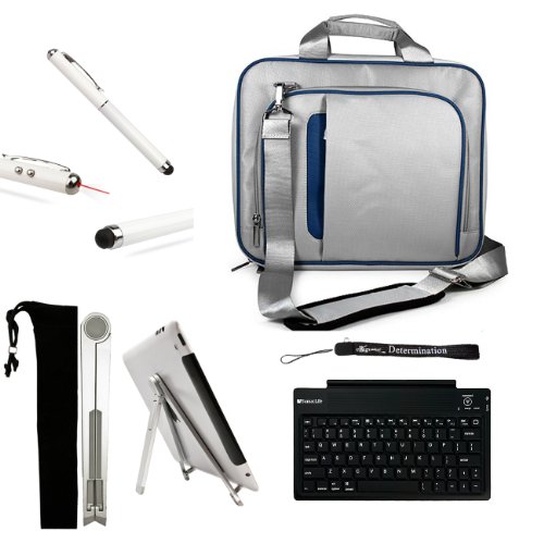 Ultra Slim Edition Portable Fitted Shoulder Bag // Case was built to protect your Favorite Device, this case offers extra compartments to keep your accessories with you at all time and organized. The main compartment was built with extra padded cushion to protect your device from any small and big objects. This case is build with durable ballistic nylon material. The bag is featuRED with an interior mesh pocket that can be useful for any keyboard or a slim accessory, also this bag is featuRED with a front pocket that can be used to place all of your tablets accessories or up to any additional gadgets such as cell phone, PSP, digital camera, mp3 player and more. FeatuRED with 2 handles one on each side they are strong enough and durable to hold your tablet with any accessories and more, plus includes a removable matching shoulder strap with extra patted material, providing you the best comfort on your shoulder// Overall this is a perfect travel bag that can carry more than just your favorite gadget, with the nylon material it will maintain its shape at all times and with the extra padded cushion compartments it will always maintain your top of the line device protected. // Includes a Slim Travel Wireless Bluetooth Keyboard // Includes a Pocket 2 Way Adjustable Tablet Stand fits anywhere and feels Strong and Sturdy // Includes a Professor Pen 3 in 1 Red Laser Pointer / LED White Light / Stylus / White Pen // Includes an eBigValue (TM) Determination Hand Strap Keychain for your Keys